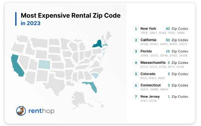 The top 100 most expensive ZIP codes in the country are in only seven states, according to the report from the online rental marketplace. New York led the way with 42, followed by California, Florida, and Massachusetts.