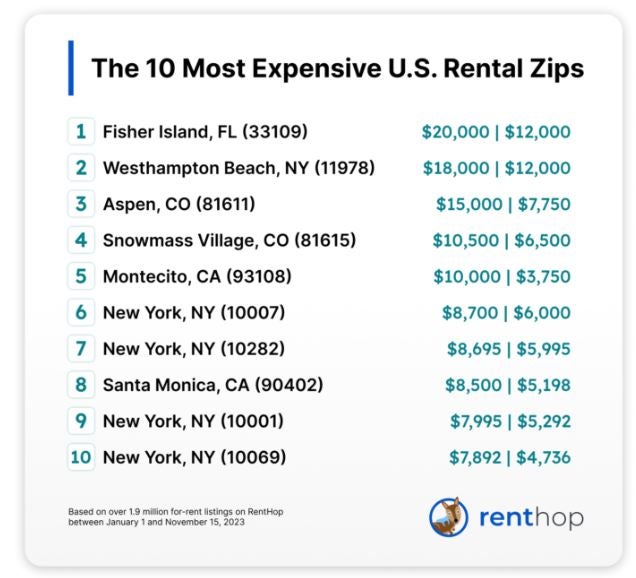 The most expensive ZIP code in the United States was Fisher Island, Fla., with an average rent of $20,000 for a two-bedroom and $12,000 for a one-bedroom rental.