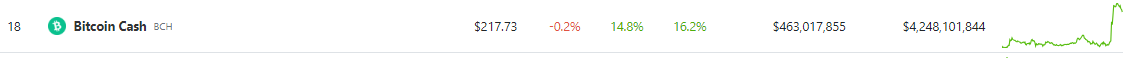 With Bitcoin Cash exhibiting a robust price rally, the digital asset’s value soared to $217, as reported by CoinGecko. Over the span of 24 hours, the coin witnessed an impressive surge of 14.8%, which further expanded to 16% over the course of the past week.
