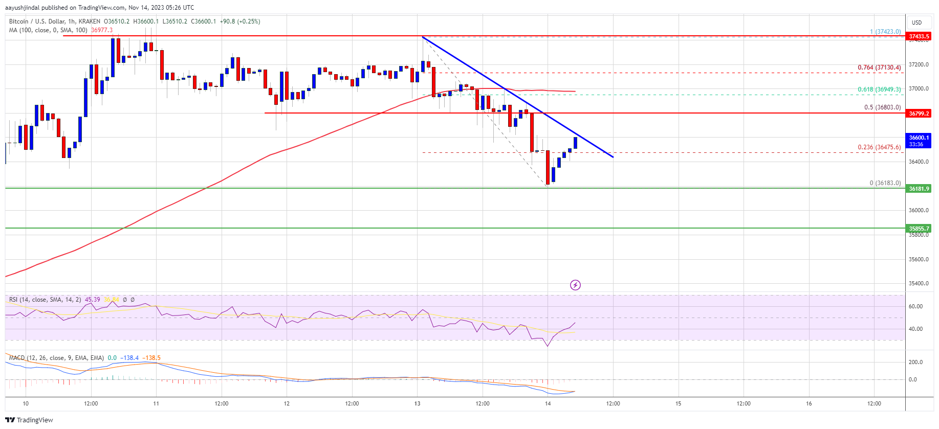 There was a move below the $37,000 pivot level. The price declined below the $36,500 level but stayed above $36,000. A low is formed near $36,183 and the price is now rising. There was a move above the $36,450 level. The price is trading above the 23.6% Fib retracement level of the recent decline from the $37,423 swing high to the $36,183 low.